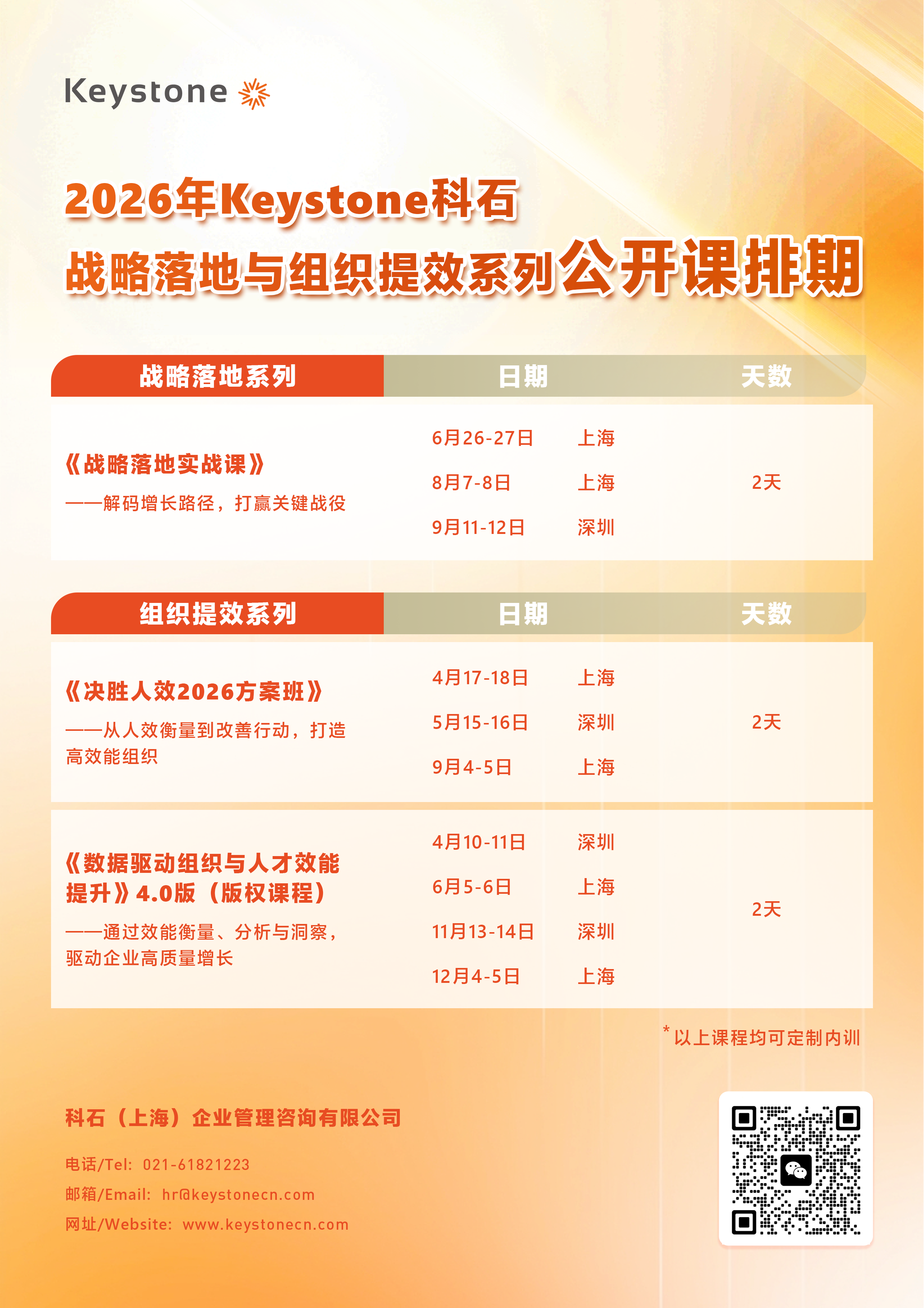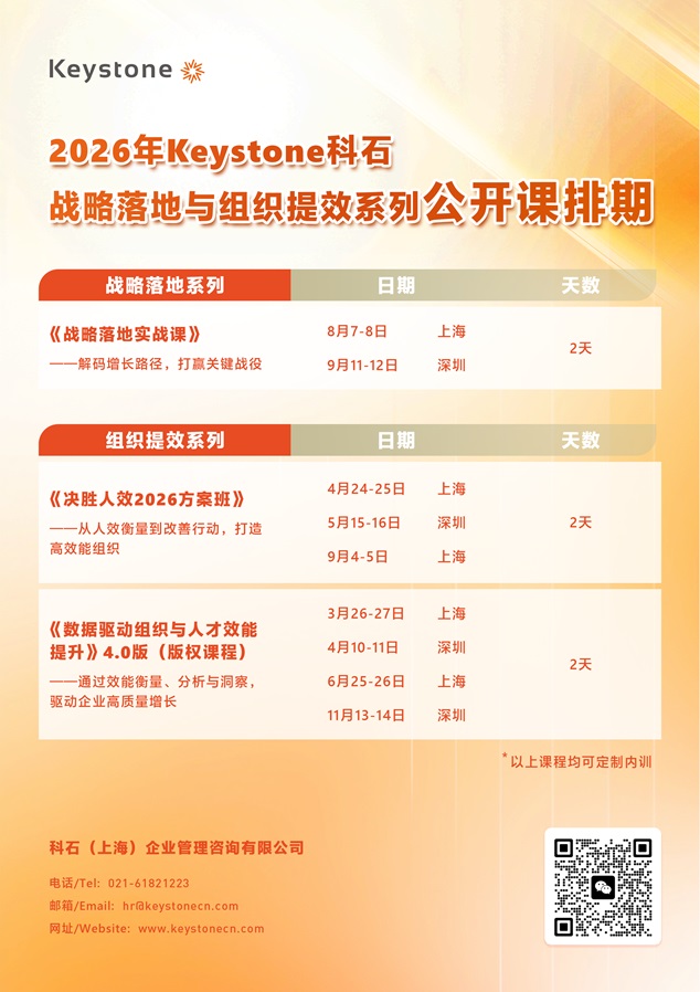 许多企业正面临战略落地不畅、人效衡量模糊、数据无法驱动决策等多重困境,企业高管和人力资源负责人亟需突破传统管理边界,掌握适配新时代的管理工具与实战方法。为此,Keystone科石推出2026年度原创精品公开课,三门课程以实战导向破解管理难题,助力企业实现 “战略、组织、人” 的协同升级。