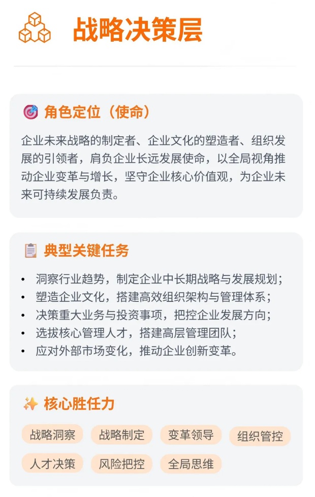 战略决策层(企业高管、核心决策者)属于企业顶层管理者,核心任务是把控企业未来发展方向。定战略,即洞察市场趋势,结合企业资源,制定长远发展战略与业务布局;造土壤,即塑造企业文化,搭建组织架构,完善管理体系,打造适合人才发展的组织环境;断事用人,即精准决策重大事项,选拔任用核心人才,统筹调配企业资源,保障战略落地。